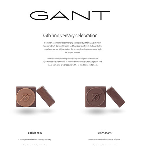 Chef Jungstedt hjälpte Gant att fira sitt 75-årsjubileum med boliviansk perfektion i choklad med ett stämplat 75 emblem på toppen av de skurna pralinerna.